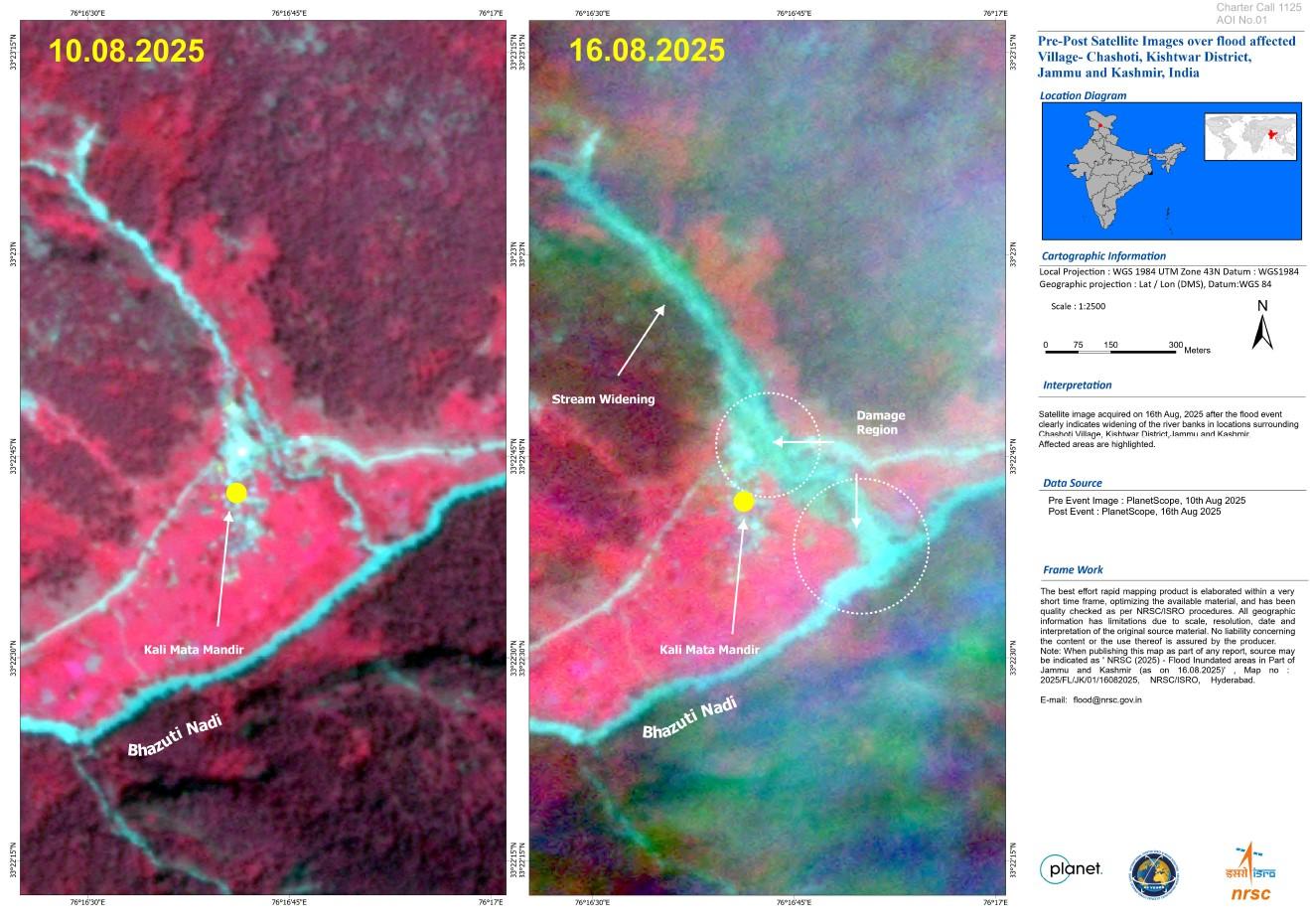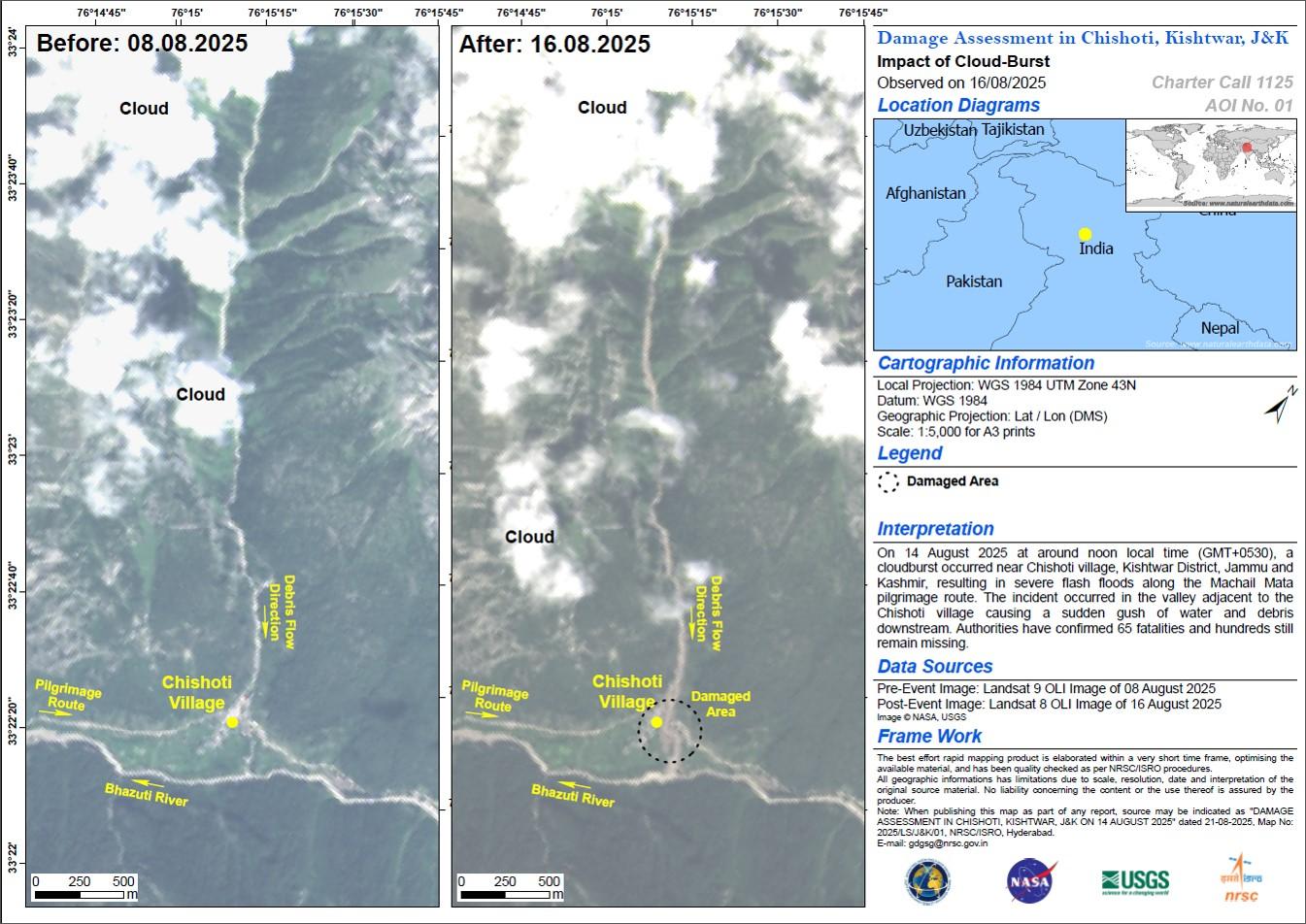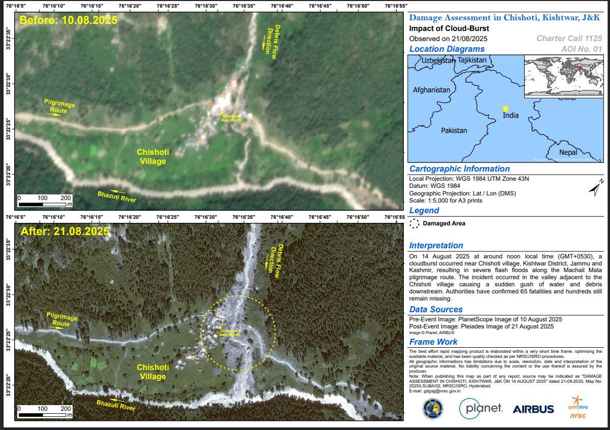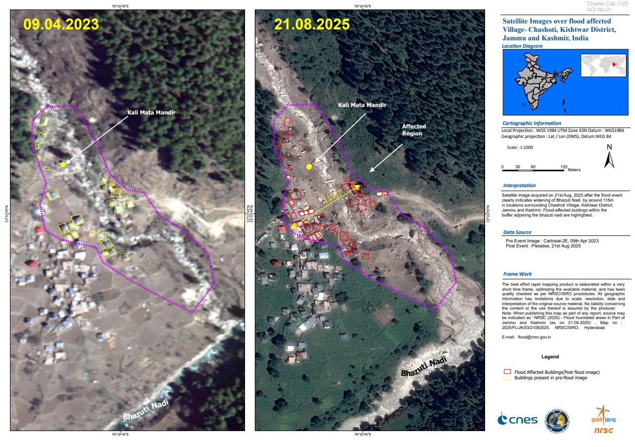 Heavy downpour in India, triggered landslides and flash floods on 17 August, causing widespread damage in several areas, including Panarsa, Takoli, and Nagwain.