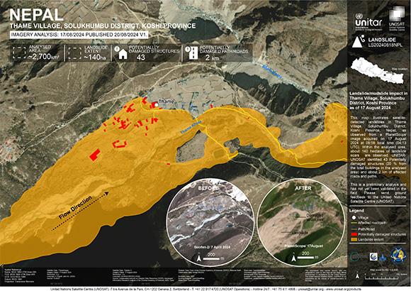 The flood severely damaged the village of Thame. Though no lives were lost, 20 houses, a school, and health clinic were destroyed by debris and boulders swept down the mountain by flood waters.