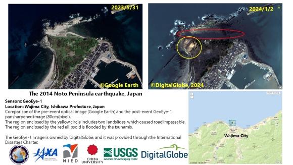 Ocean waves monitored by the International Charter: Space and Major Disasters are most commonly tsunamis, although strong winds from storms can also create hazardous coastal waves. Tsunamis are seismic sea waves that typically result from underwater earthquakes or volcanic eruptions. However, they can also be triggered by other factors, such as ice calving from glaciers or meteorites.
