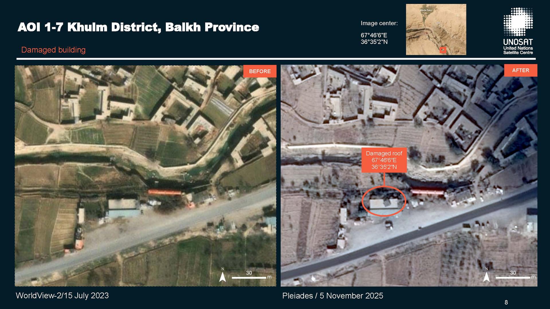 On November 3rd, 2025, the United Nations, through its UNOSAT branch, requested the activation of the Charter following a 6.3 magnitude earthquake near the city of Mazar-e Sharif in Afghanistan. The event occurred on November 2nd, 2025. A preliminary report indicates 20 deaths and 400 injuries. UNOSAT requested this activation in order to identify affected areas and support search and rescue operations.