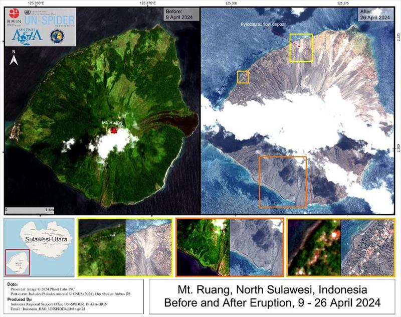 Mount Ruang, Indonesia.Data Copyrights: Includes Pleiades material © CNES (2024), Distribution Airbus DS. PlanetScope © Planet Labs Inc. (2024) Map produced by Indonesia Regional Support Office, UN-SPIDER, INASA, BRIN
