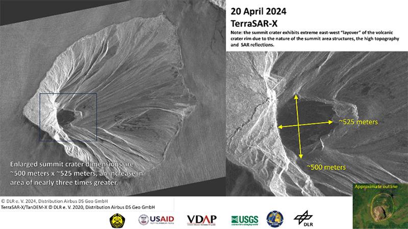 EOS-RS Damage Proxy Map: Volcanic impact assessment to Gunung Ruang, Indonesia: summit crater enlargement As Observed by TerraSAR-X image 20 April 2024 © DLR e.V. (2024), Distribution Airbus DS Geo GmbH Map produced by Ministry of Energy and Mineral Resources of Indonesia