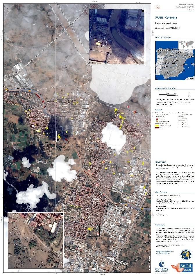 This support begins with an initial activation by an ‘Authorized User’ requesting help from the Charter. An Authorized User is typically a representative of a national civil protection agency. Following the successful review of the AU’s request, the Charter is activated to acquire satellite data of the disaster. Whether a flood, a fire, or any other emergency, the first step is to establish the nature and location of the disaster so the Charter team can provide the most appropriate satellite data needed to generate value-added products. The detailed information provided by the Authorized User, via an online form, allows us to establish whether visual or radar data are the most appropriate for the activation. The resulting value-added product may take the form of an impact map, like the one below from the devastating flood in southern Spain in November 2024.